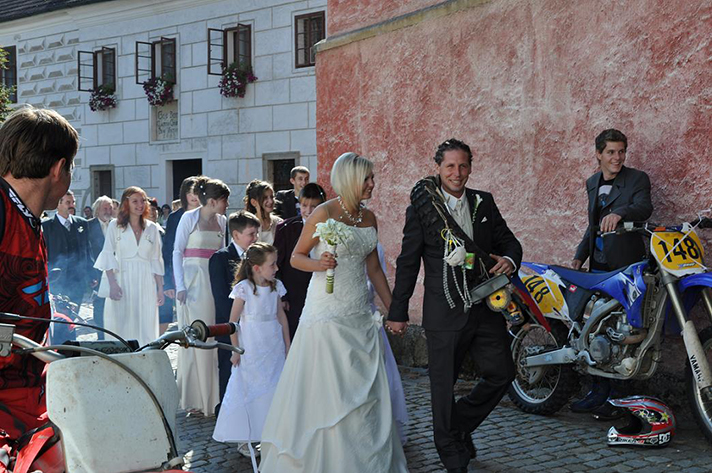 Ještě nesmím zapomenout na datum 26. 9. - to se konala moje svatba a kluci KRTCI mě jeli doprovodit jak jinak, než na svých motorkách. Cesta na svatební obřad byla pro mě naprosto uklidňující. Kolem mého auta samá motorka a na nich moji kamarádi. Po obřadě, když jsme vycházeli ven, mě kluci ověnčili motokrosovým drapákem a následný průchod špalírem vytvořený z motokrosových motorek s nastartovanými motory byl pro nás nezapomenutelný zážitek (myslím si, že i pro místního správce kláštera - vlasy mu asi stojí ještě teď).